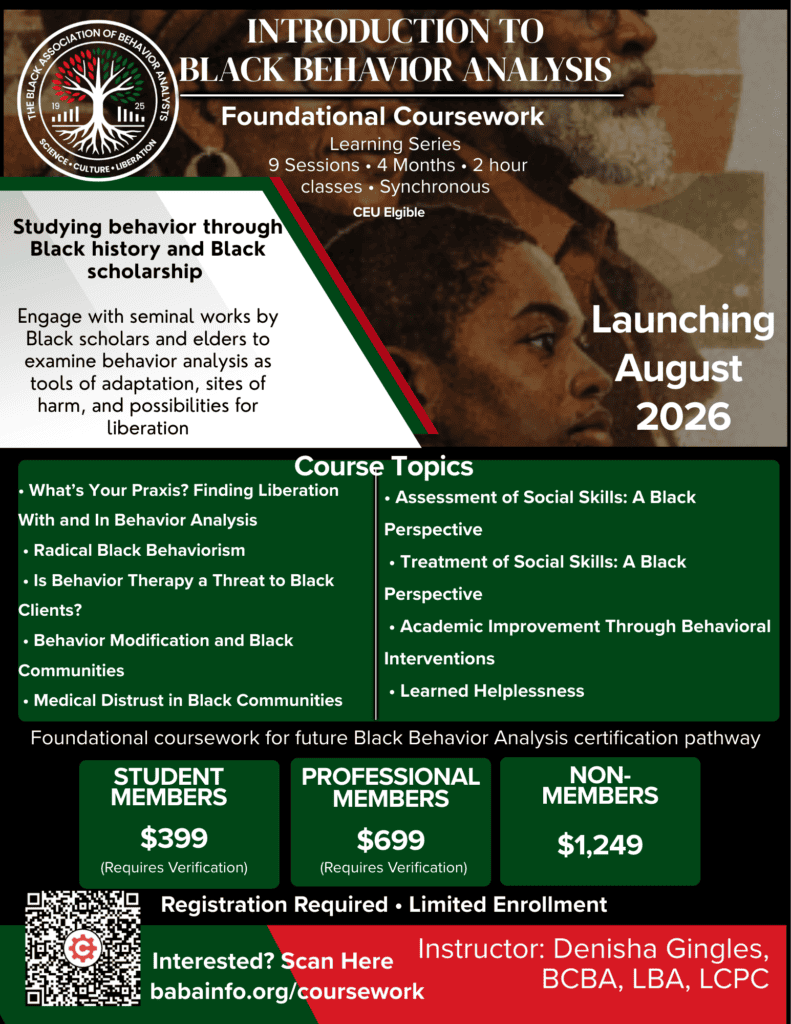 This learning series engages seminal, published works by Black Behavior scholars and elders to critically examine how behavior analysis and have intersected with Black communities.